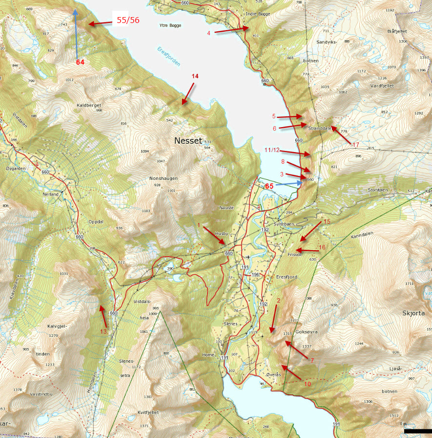 Karta viser piler med nummer i samsvar med oversikta, oppdatert pr feb -26.