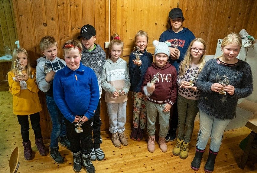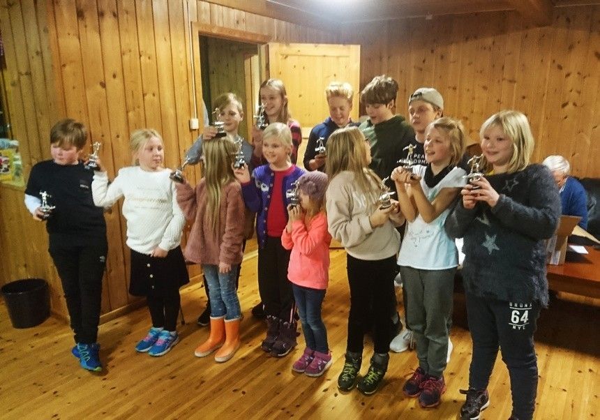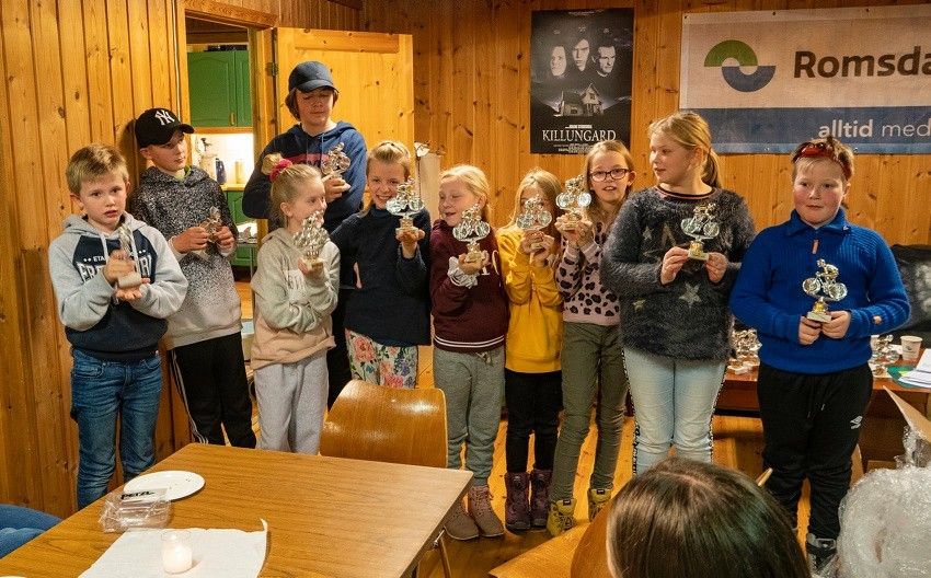 Det aula godt med barn og ungdom under klubbkvelden til Eresfjord I.L. torsdag 20. nov. Her ser vi noen av dei 30-barna som var med på skitrimmen sist vinter. Alle vart premiert.