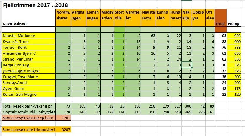 Fjelltrimmen 2018-2019 viser at det samla var 3072 besøk fordelt på dei 12 trimpostane. Av dette var det 1497 frå Eresfjord. Av bygdafolk var det 125 forskjellige vaksne og 43 barn som har skreve seg inn i trimbøkene. Av dei vaksne med besøk på alle 12 postar var det Berit Torjuul som skora flest besøk med 820 poeng. Rett bak kom Bjørn C. Alexander med 720 poeng og Tone Kvamsås med 675 poeng. Likevel, Marianne Nauste som ikkje fekk fullført alle 12 postane, skora 1005 poeng med sin 10 besøkte postar. Det var 9 vaksne som har besøkt alle 12 postar og 10 barn som har besøkt minst 6 av dei 12 postane. Hundneset var den desidert mest besøkte posten med 607 besøk, deretter Nakkjin med 540 og Naustestera med 327 besøk. Her kan du sjå den fullstendige lista med besøk sortert etter poeng for dei vaksne. Kolonne med verdien SANN betyr at dei har besøkt alle 12 postar. Tilsvarande liste over besøk av barn finn du her. Lenger ned oversikt dei med 12 og 6 postar.