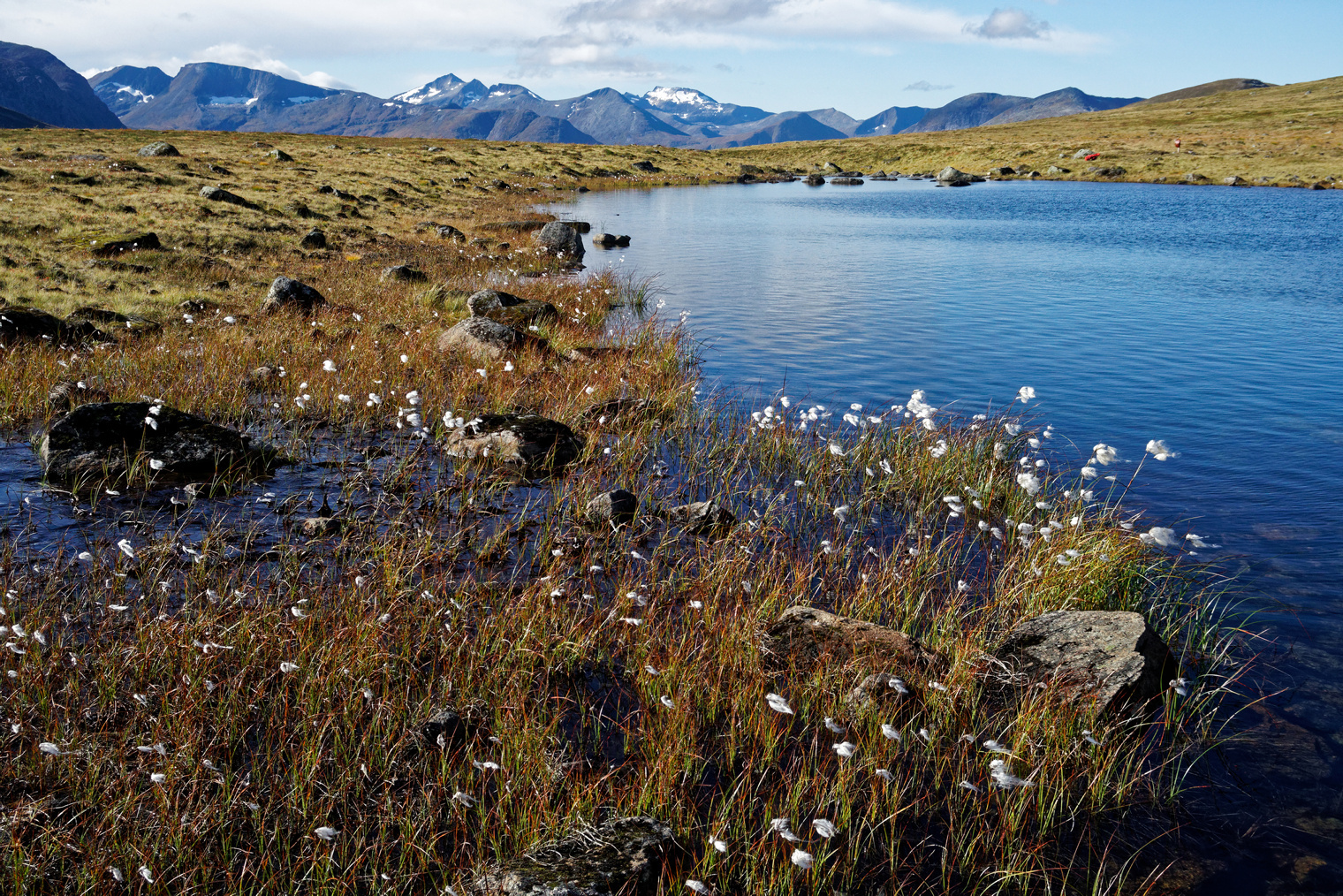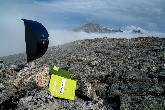 Den nye Fjelltrimposten ligger idyllisk til like attmed den vesle tjønna med myrull i Kvilhaugbotn. Rett attmed stien, ca 920 moh. Med utsikt mot Skjorta (tv) og Litjskjortene.
