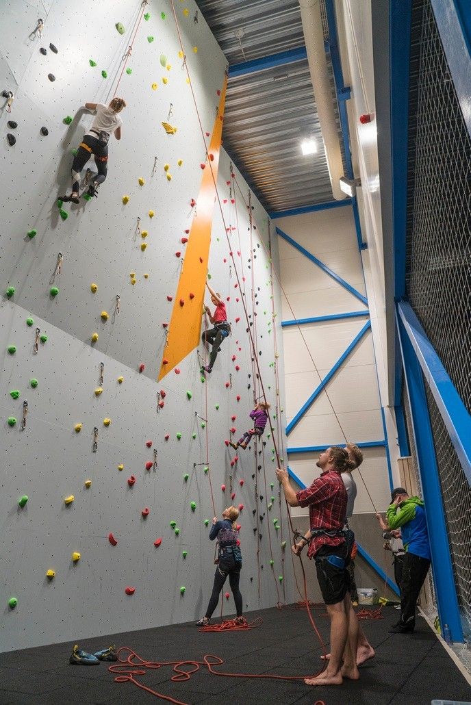 Klatreveggen i Nessethallen er 15 meter lang og har ei høgde på litt over 10 meter. Har 15 sikringslinjer.