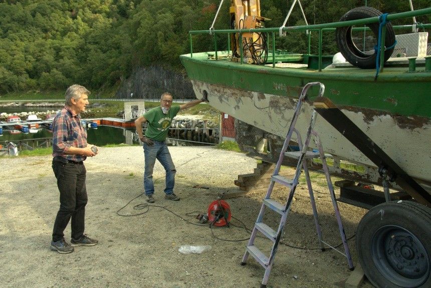7.mai 20: Reparasjon av flytedunkar ... kjekt å ha stålbåt med kran når dei må tømmast for vatn.