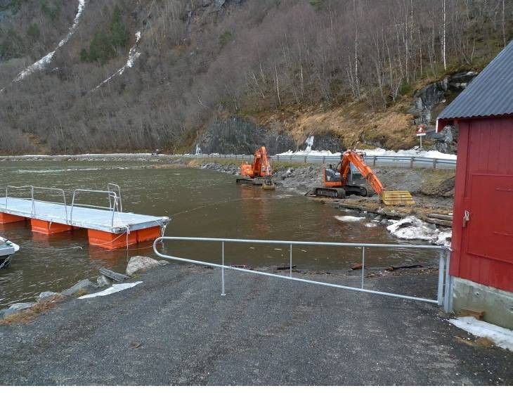 2 gravemaskiner og ein traktor har vore i aksjon for å mudre ut større djubde der dei nye flytebryggene skal monterast.