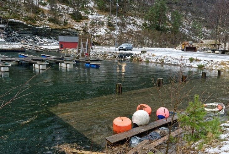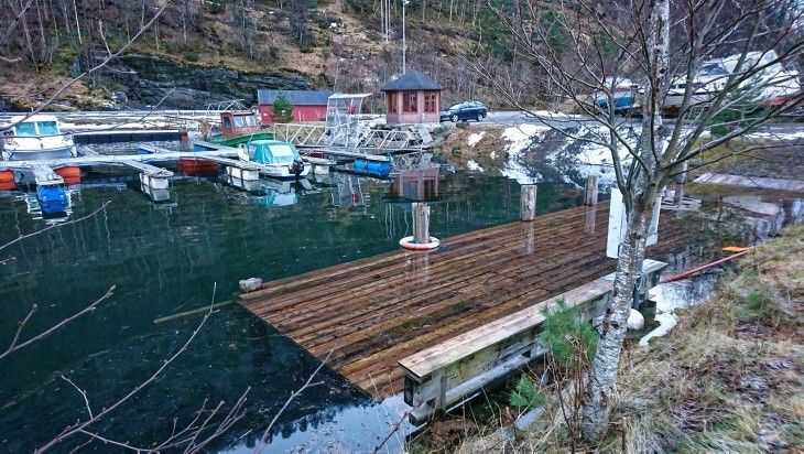 Sterk vind i morgontimane til torsdag 5.des. så blåste gangvegen til flytebryggene av. Viste seg at den eine kjettingen inn mot land også var slitt av. Kranbil vart bestilt og gangvegen effektivt heisa på plass igjen. Dugnadsgjengen av pensjonistar fekk også montert ny kjettingbardun inn mot land. Det er ikkje første gong at gangvegen har blåst av. Har skedd fleire gonger før.